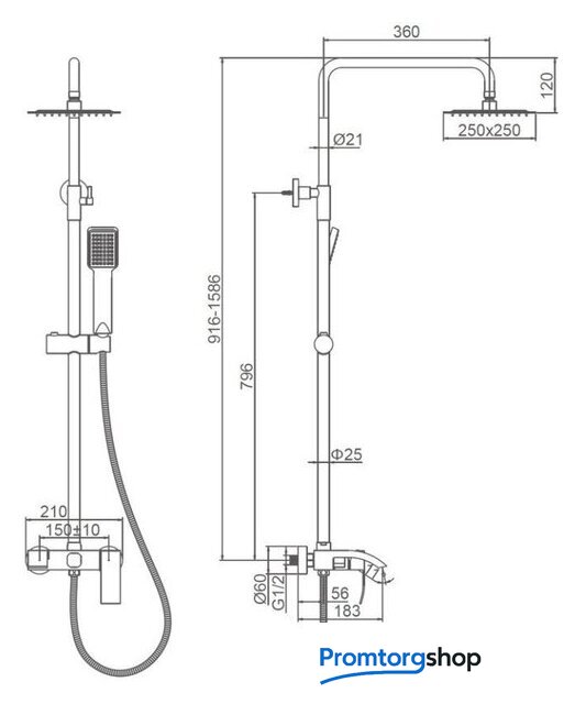 | Диаметр (ширина) верхнего душа | 250 мм |
