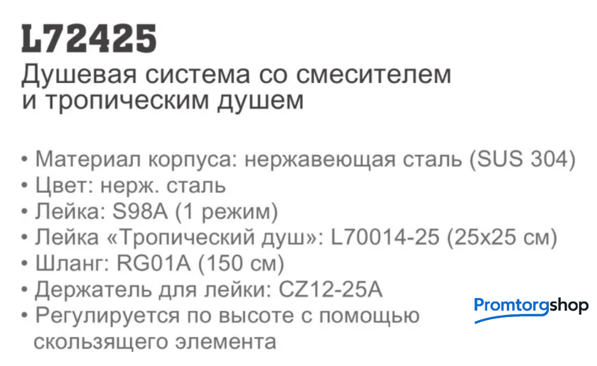 | Материал душа | нержавеющая сталь (SUS 304). Материал ручного душа пластик |