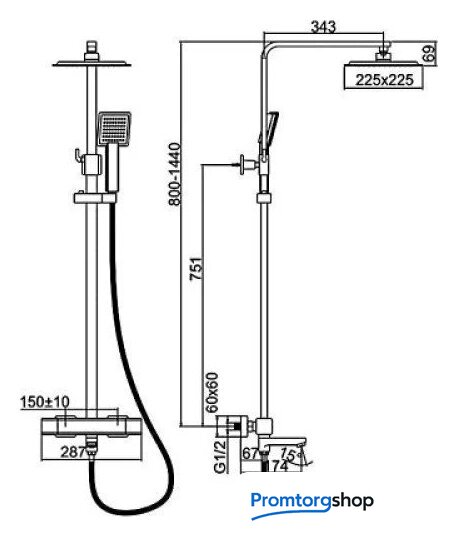 | Диаметр (ширина) верхнего душа | 225 мм |