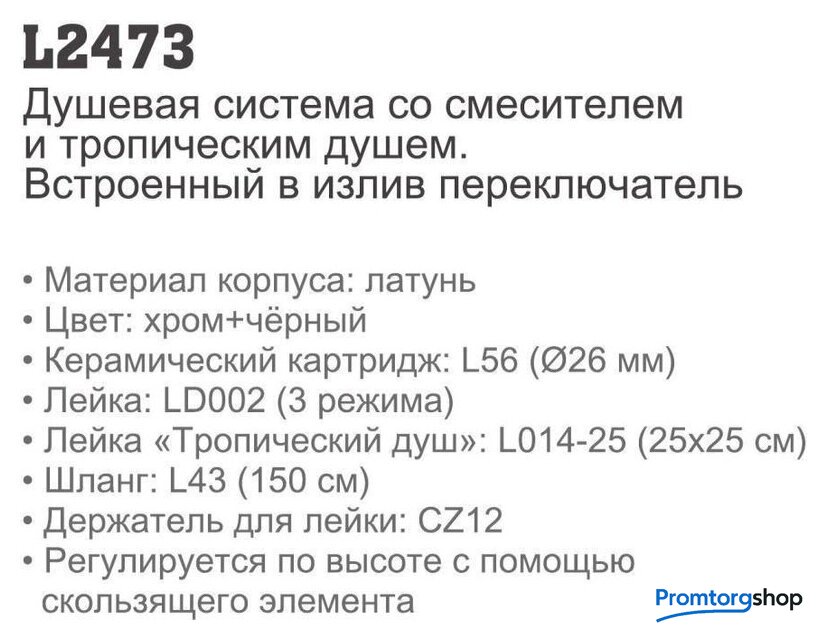 | Комплектация | верхний душ, штанга, ручной душ (лейка), держатель лейки, шланг, смеситель, излив для ванны |
