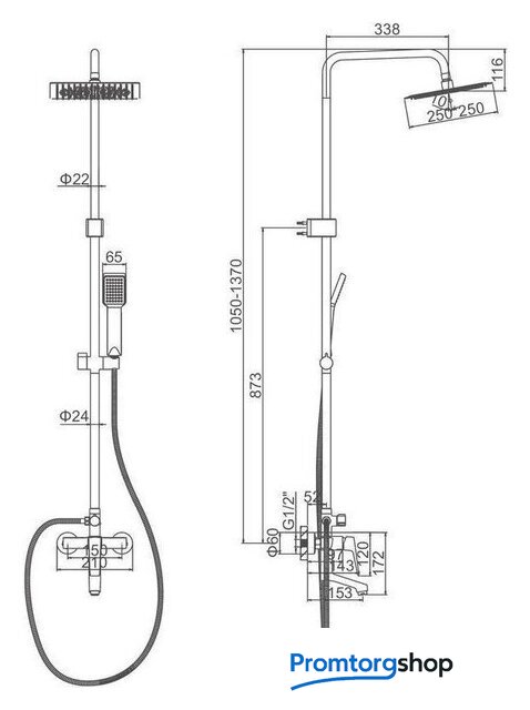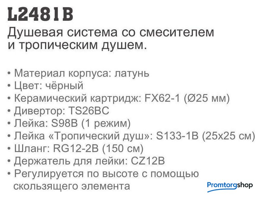 | Комплектация | верхний душ, штанга, ручной душ (лейка), держатель лейки, шланг, смеситель, излив для ванны |