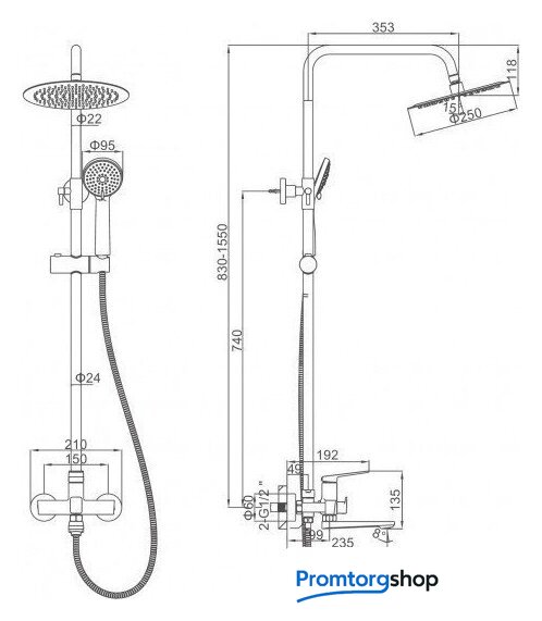 | Диаметр (ширина) верхнего душа | 250 мм |