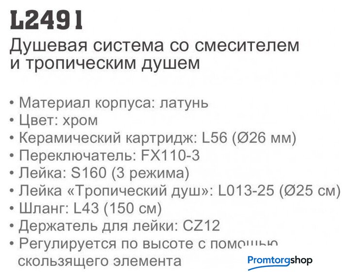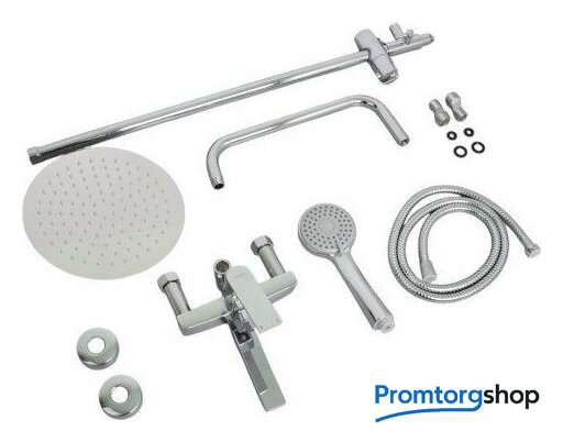 | Комплектация | верхний душ, штанга, ручной душ (лейка), держатель лейки, шланг, смеситель |