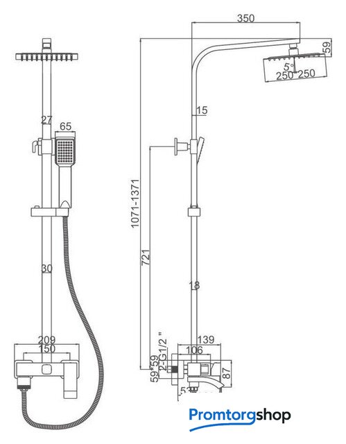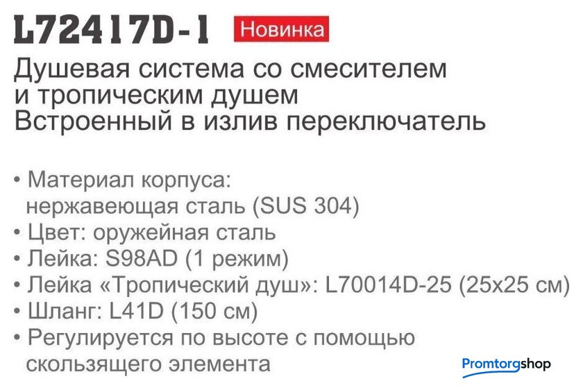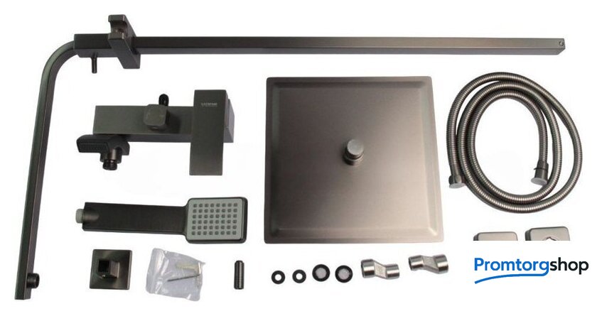 | Комплектация | верхний душ, штанга, ручной душ (лейка), держатель лейки, шланг, смеситель, излив для ванны |