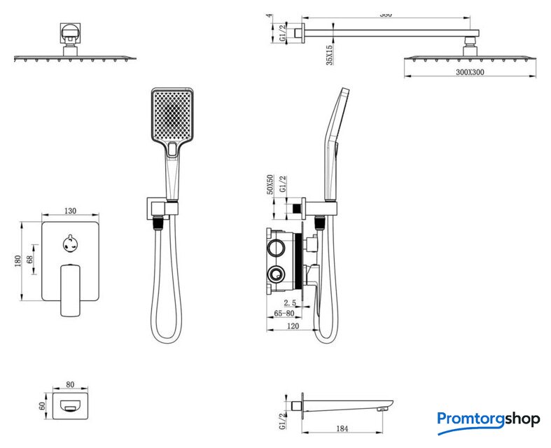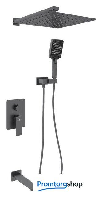 | Комплектация | верхний душ, ручной душ (лейка), держатель лейки, шланг, смеситель, излив для ванны |