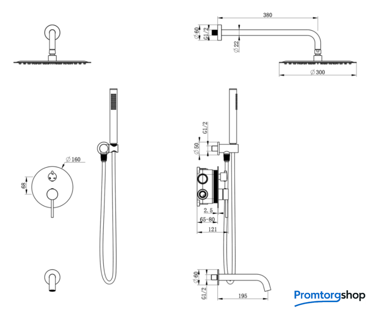 | Диаметр (ширина) верхнего душа | 300*300 мм |