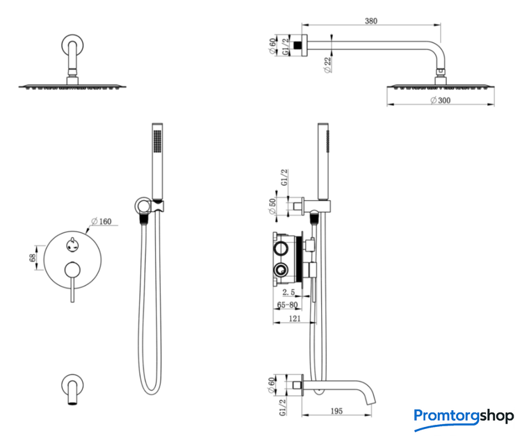 | Диаметр (ширина) верхнего душа | 300*300 мм |