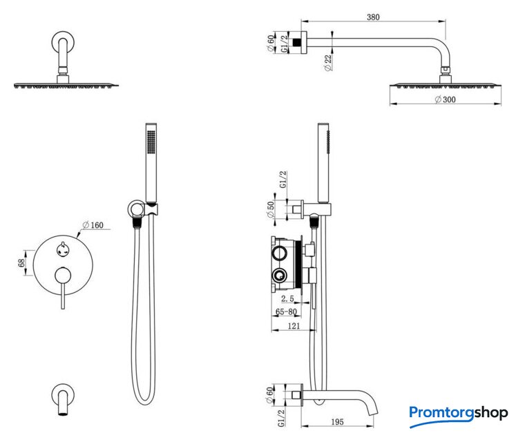 | Комплектация | верхний душ, ручной душ (лейка), держатель лейки, шланг, смеситель, излив для ванны |