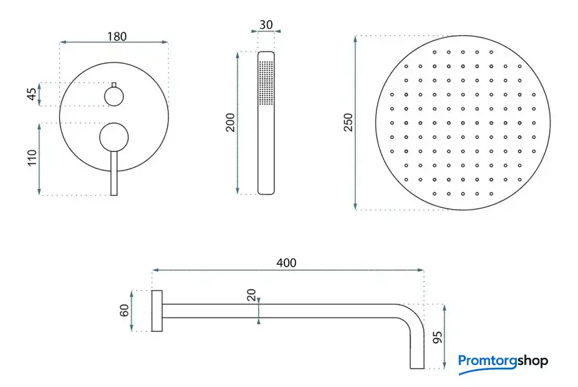 Диаметр (ширина) ручного душа | 200*30 мм |