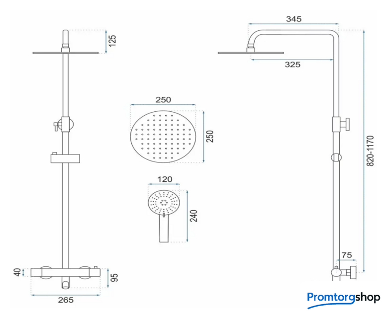 | Диаметр (ширина) верхнего душа | 250*250 мм |