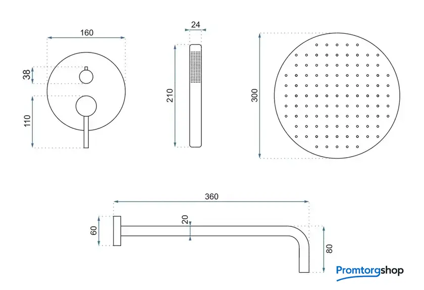 | Диаметр (ширина) верхнего душа | 300 мм |