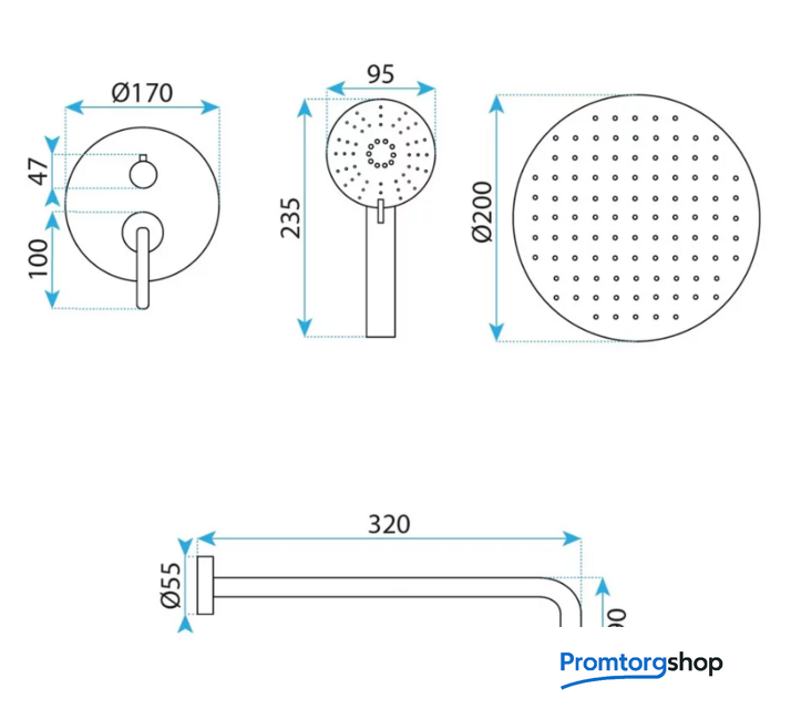 | Диаметр (ширина) ручного душа | 95*235 мм |