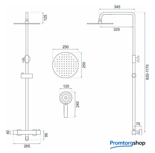 | Диаметр (ширина) верхнего душа | 250 мм |