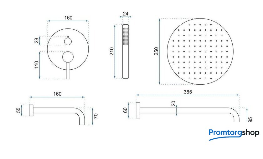 Диаметр (ширина) верхнего душа | 250 мм |