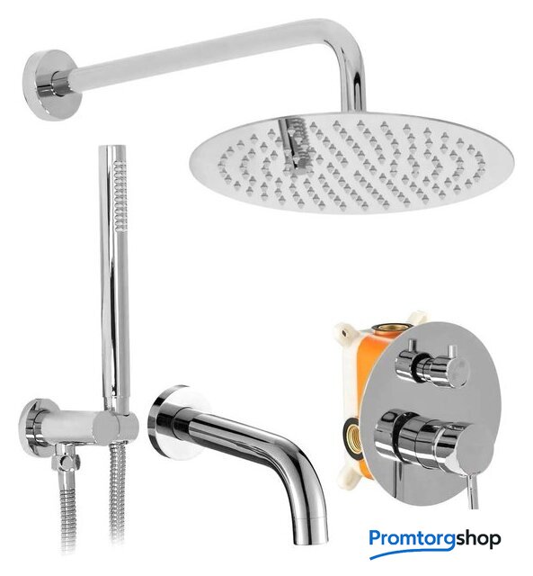 Комплектация | верхний душ, ручной душ (лейка), держатель лейки, шланг, смеситель, излив для ванны |