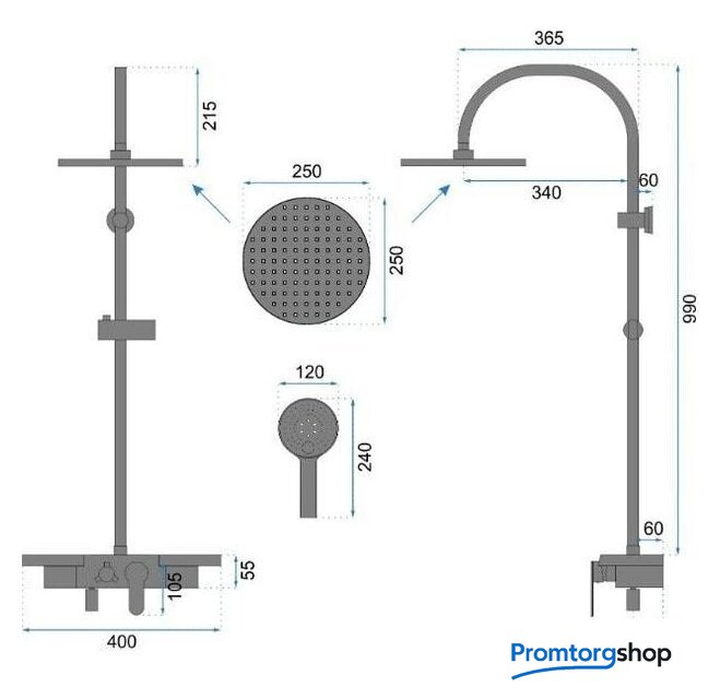 | Диаметр (ширина) верхнего душа | 250 мм |