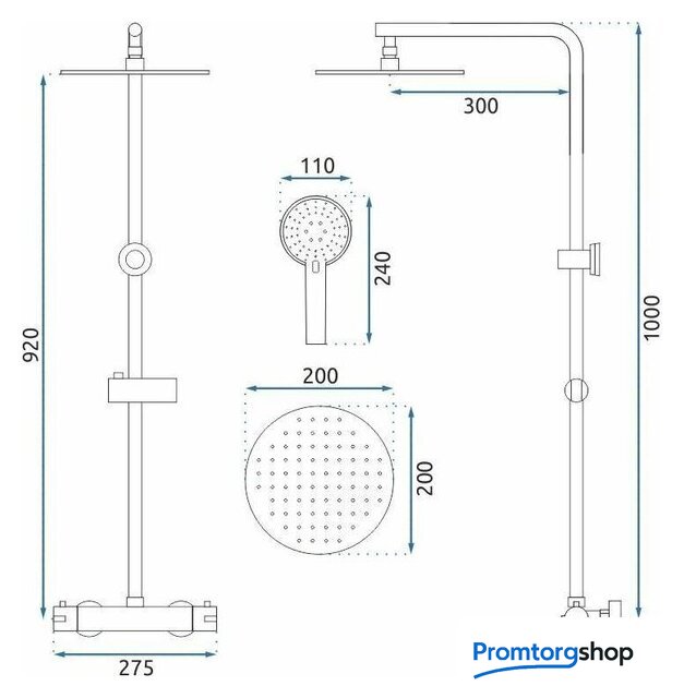 | Диаметр (ширина) верхнего душа | 200 мм |
