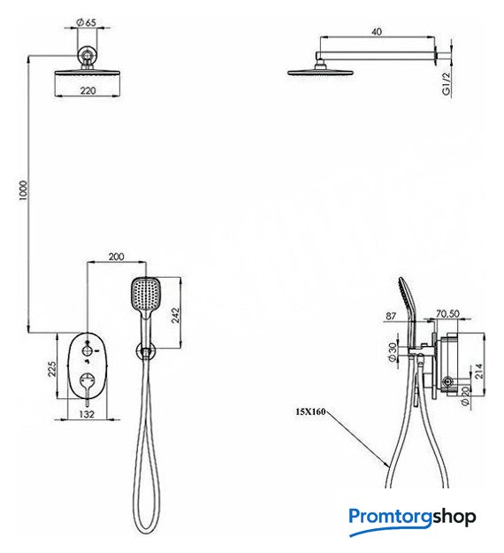 | Диаметр (ширина) верхнего душа | 220 мм |