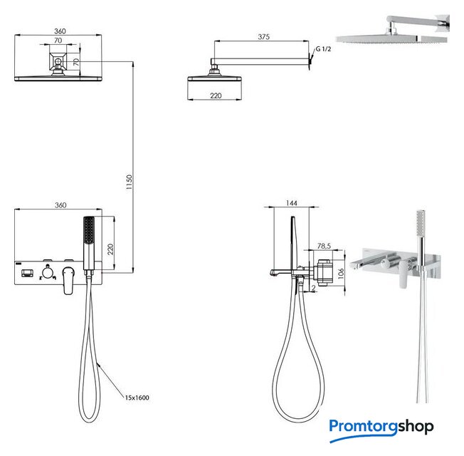 | Комплектация | верхний душ, ручной душ (лейка), держатель лейки, шланг, смеситель, излив для ванны |