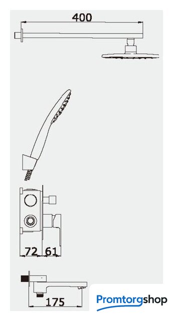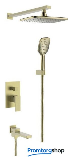 | Комплектация | верхний душ, ручной душ (лейка), держатель лейки, шланг, смеситель, излив для ванны |