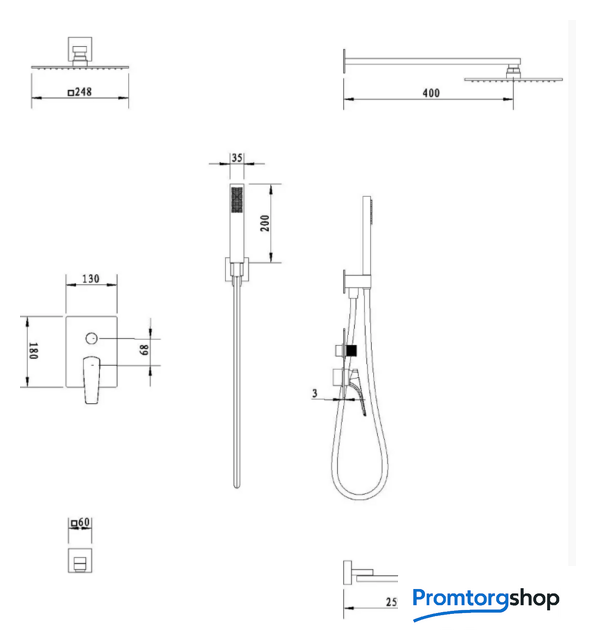 | Диаметр (ширина) верхнего душа | 248*248 мм |