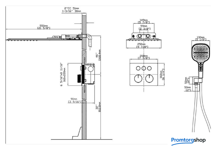 | Диаметр (ширина) верхнего душа | 550 мм |