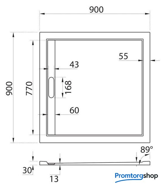 квадратный, 90x90 см, искусственный мрамор, низкий, 3 см, противоскользящее покрытие дна, цвет: белый