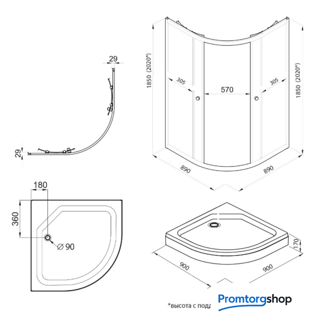 | Тип поддона | низкий. Расположение слива в углу. Форма слива круг. Диаметр слива 9 см |