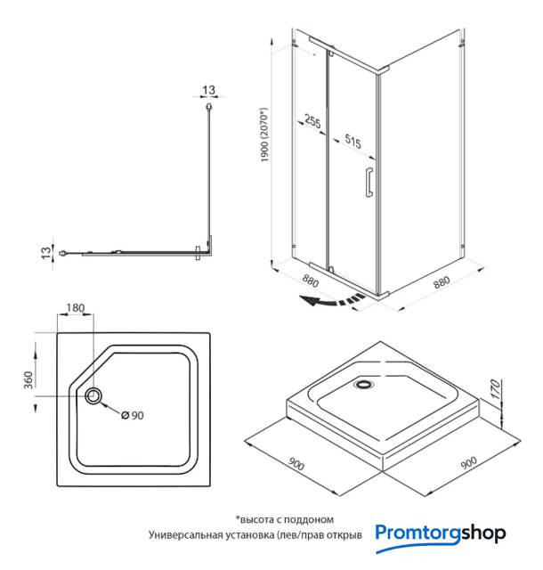 | Тип поддона | низкий. Расположение слива в углу. Форма слива круг. Диаметр слива 9 см |
