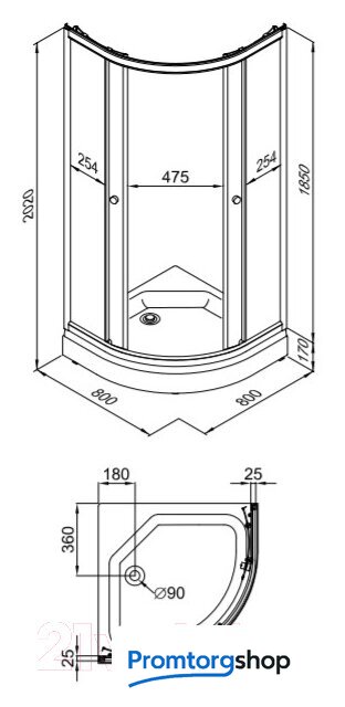 | Форма поддона | четверть круга. Расположение слива в углу. Форма слива круг. Диаметр слива 9 см |