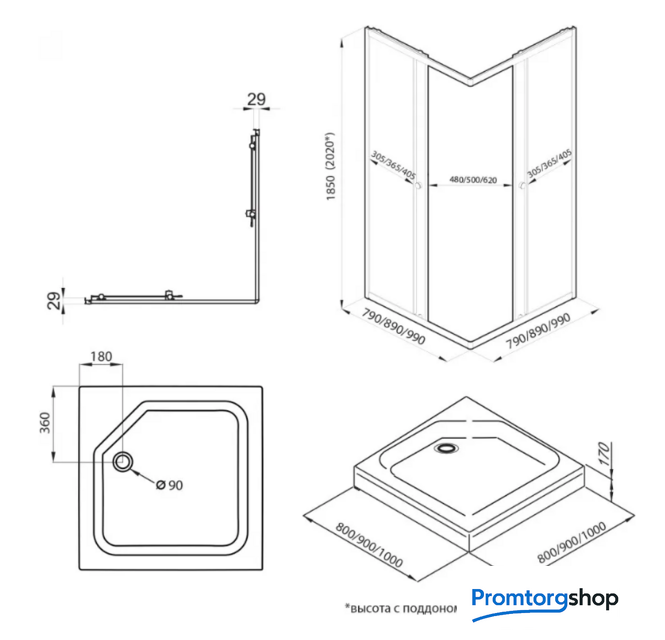 | Тип поддона | низкий. Расположение слива в углу. Форма слива круг. Диаметр слива 9 см |