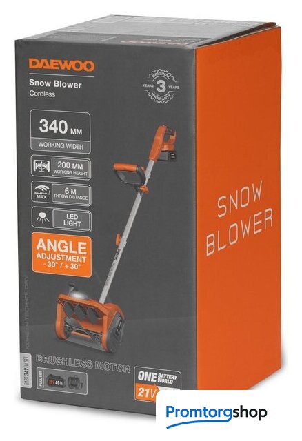 Комплектация | - Снегоуборщик- Аккумуляторная батарея 1 шт- Зарядное устройство 1 шт- Инструкция по эксплуатации- Гарантийный талон |