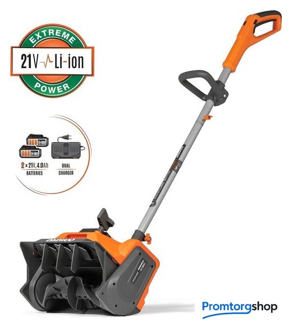 | Комплектация | - Снегоуборщик - 1 шт.- Аккумулятор 4,0 Ач - 2 шт.- Зарядное устройство - 1 шт.- Штанга - 1 шт.- Крепежные элементы 1 - комп.- Инструкция по эксплуатации - 1 шт.- Коробка |