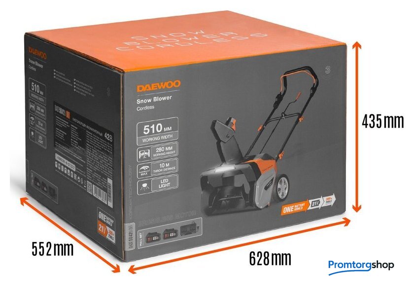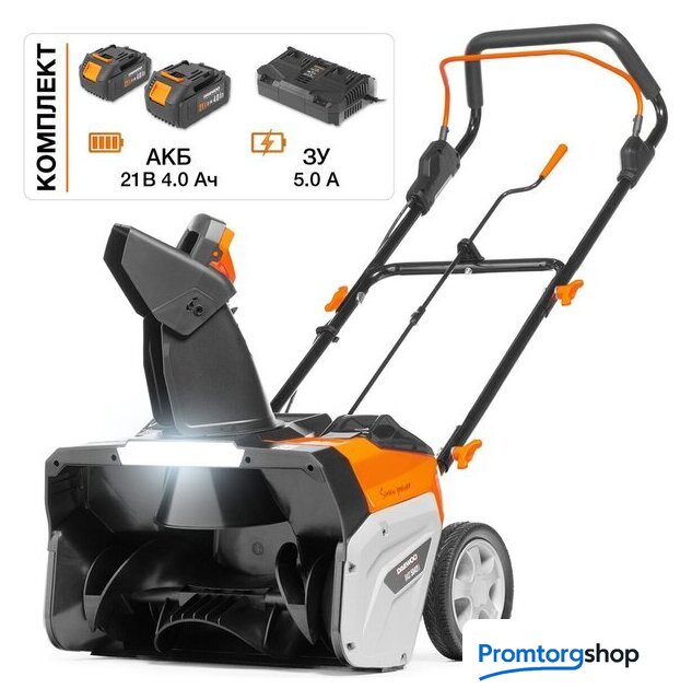 | Комплектация | - Снегоуборщик - 1 шт.- Аккумуляторная батарея 4,0 Ач - 2 шт.- Зарядное устройство - 1 шт.- Нижняя рукоятка - 1 шт.- Верхняя рукоятка - 1 шт.- Комплект крепежа 1 компл.- Рукоятка изменения направления - 1 шт.- Вал рукоятки изменения направления выброса - 1 шт.- Рукоятка трубы выброса - 1 шт.- Труба выброса снега - 1 шт.- Руководство по эксплуатации- Гарантийный талон- Коробка |