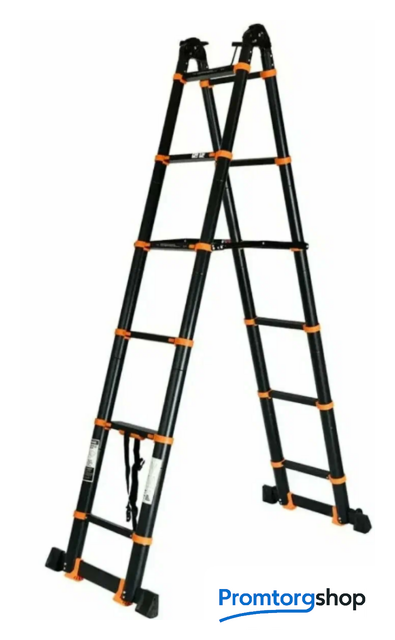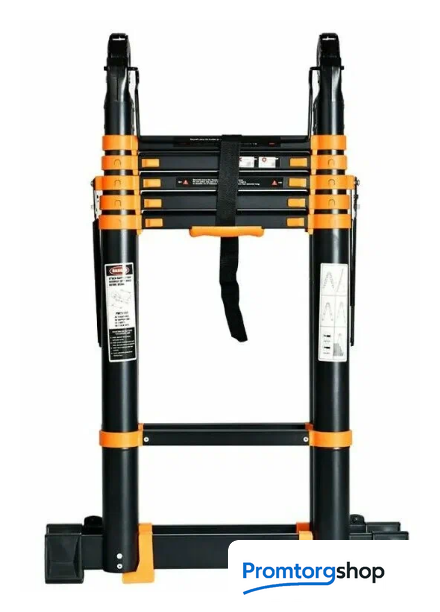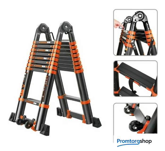 | Тип | телескопическая лестница, складная, неразборная. Особенности Дополнительная фиксация, Колесики, Накладки на ступени, Нескользящие накладки на ножки.Страна производства: Китай |