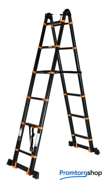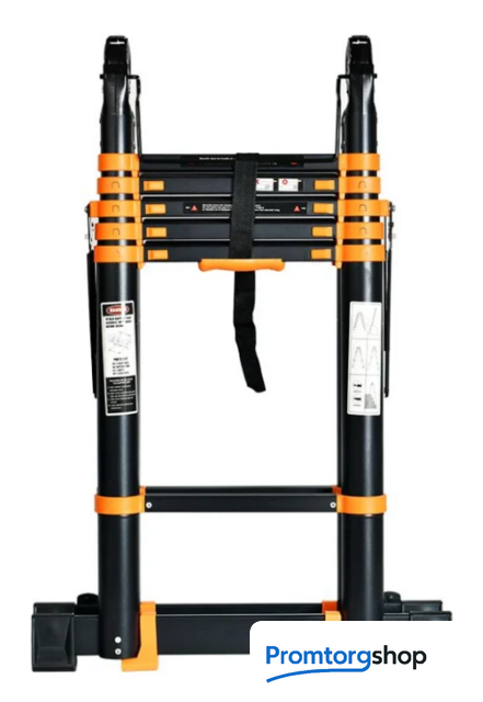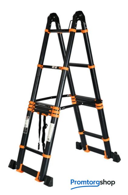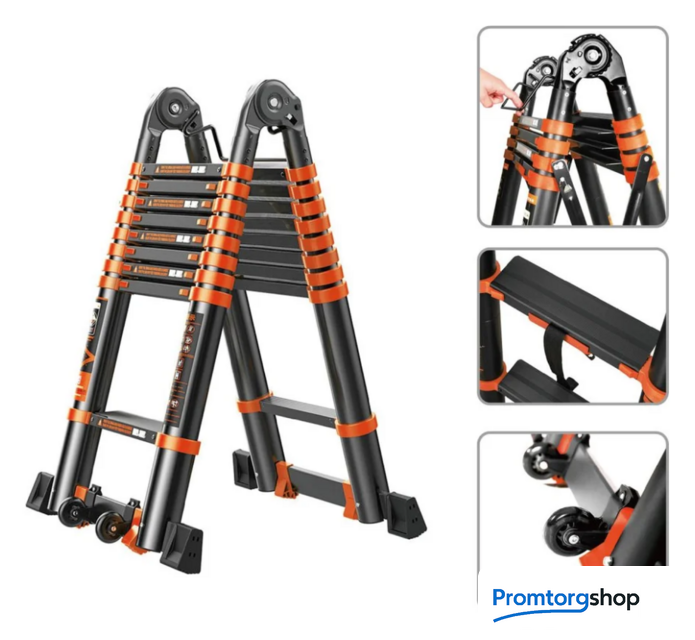 | Тип | телескопическая лестница, складная, неразборная. Особенности Дополнительная фиксация, Колесики, Накладки на ступени, Нескользящие накладки на ножки.Страна производства: Китай |