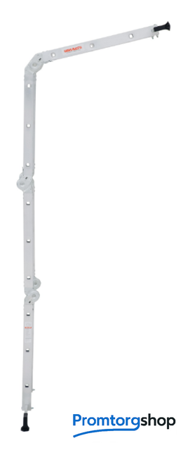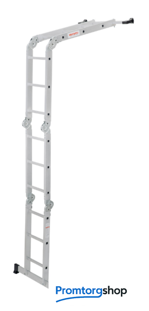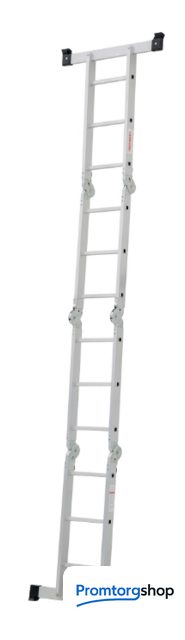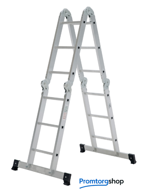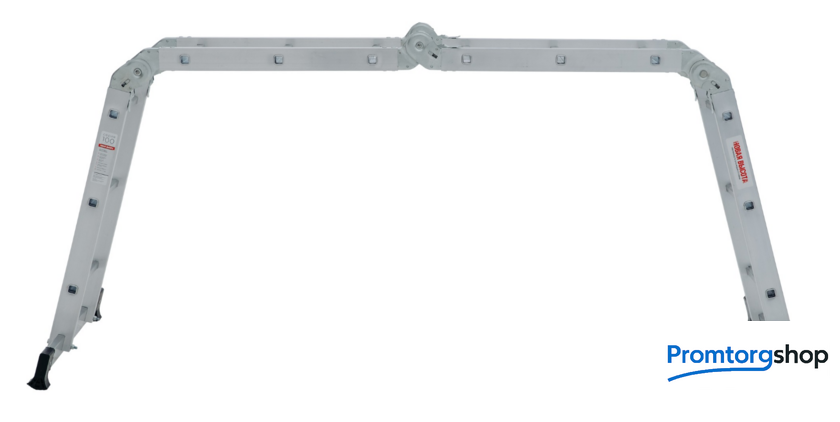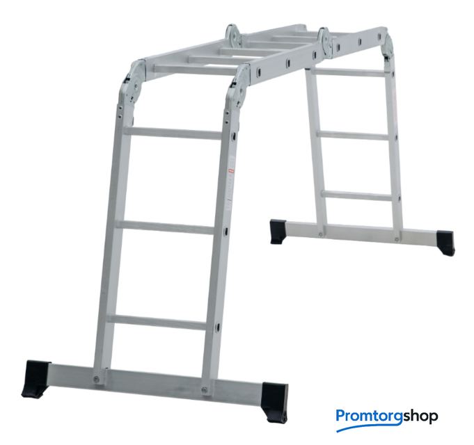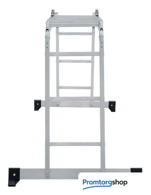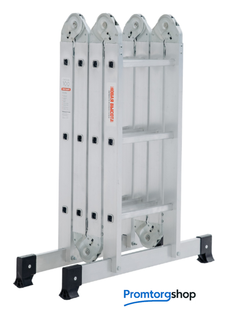 | Тип | лестница-трансформер, складная, неразборная. Универсальная шарнирная лестница-трансформер «4 в 1». Варианты использования: приставная лестница, стремянка, Г-образная лестница, помост. Ширина трансформера 340 мм Максимальная нагрузка в положении помост - 100 кг, в остальных положениях - 120 кг. Ступени с рифлением для безопасного подъёма и спуска Стойки и ступени изготовлены из прессованного алюминиевого профиля Стойки с дополнительным усилием в наиболее нагруженных местах для повышения жёсткости Многократная развальцовка в соединении ступеней со стойками обеспечивает высокую прочность и долговечность Шарнирные замки регулируются одной рукой Надёжная автоматическая фиксация Широкие поперечные траверсы обеспечивают высокую устойчивость при работе во всех положениях Башмаки траверсы препятствуют скольжению, они надёжно закреплены с помощью заклёпок |