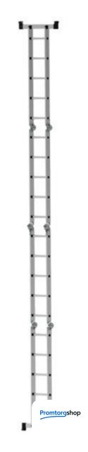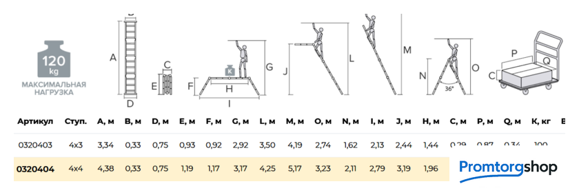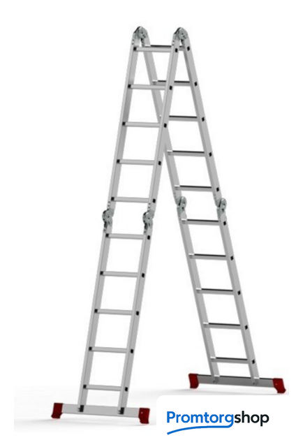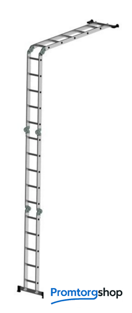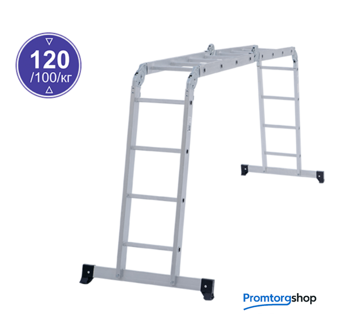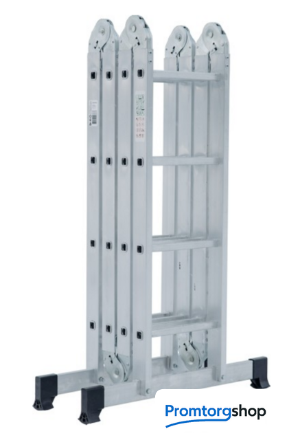 | Тип | лестница-трансформер неразборная, складная. Универсальная шарнирная лестница-трансформер «4 в 1». Варианты использования: приставная лестница, стремянка, Г-образная лестница, помост. Ширина трансформера 340 мм Максимальная нагрузка в положении помост - 100 кг, в остальных положениях - 120 кг. Ступени с рифлением для безопасного подъёма и спуска Стойки и ступени изготовлены из прессованного алюминиевого профиля Стойки с дополнительным усилием в наиболее нагруженных местах для повышения жёсткости Многократная развальцовка в соединении ступеней со стойками обеспечивает высокую прочность и долговечность Шарнирные замки регулируются одной рукой Надёжная автоматическая фиксация Широкие поперечные траверсы обеспечивают высокую устойчивость при работе во всех положениях Башмаки траверсы препятствуют скольжению, они надёжно закреплены с помощью заклёпок |