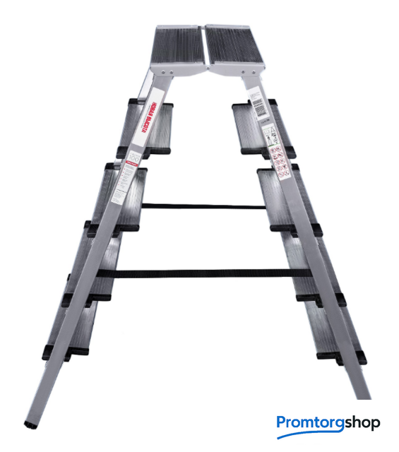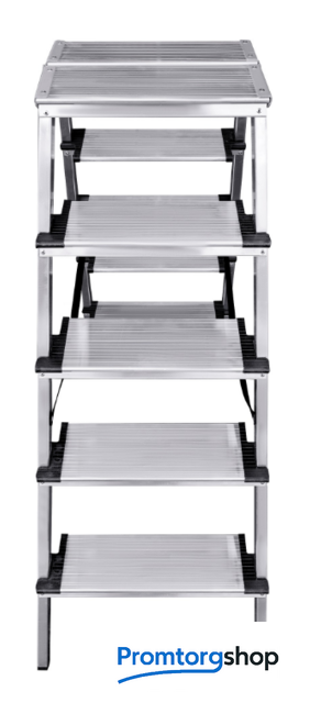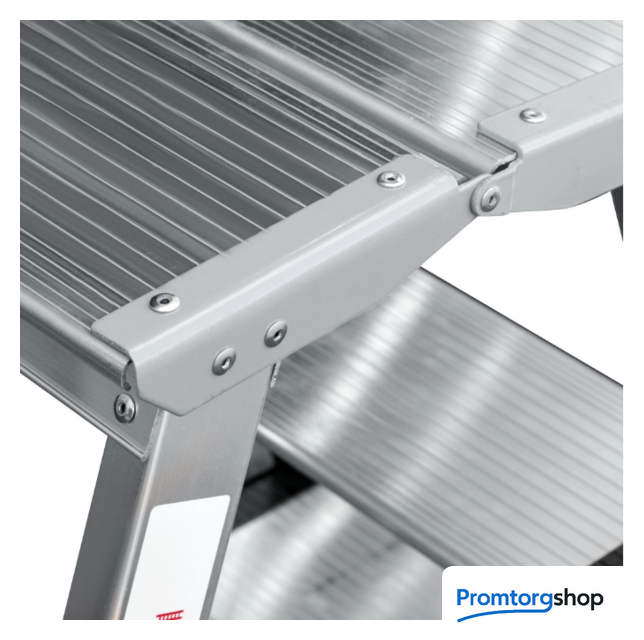 | Тип | лестница-стремянка, складная, неразборная. Лёгкая и прочная подставка для бытового использования. Доступ к рабочему месту без перестановки. Ноги не устают при длительной работе. Алюминиевая складная площадка 350×260 мм из 2 ступеней. Увеличенный радиус работы. Каждая ступень — площадка глубиной 130 мм. Меньше усталости при длительной работе. Стойки и ступени из экструдированного алюминиевого профиля. Заклёпочное крепление ступеней. Высокая статическая и динамическая прочность. Закруглённые безопасные края ступеней и площадки смягчают контакт с голенью, предотвращают травмы. Пластиковые повторяющие рельеф заглушки ступеней с длительным сроком службы скрывают острые грани и углы. Страховочные погодоустойчивые ремни на заклёпках с увеличенной шляпкой. Создают жёсткую конструкцию. Не гниют и не выгорают. Башмаки из прочного пластика. Не скользят и не повреждают поверхность. Компактно складывается для хранения и транспортировки. В сложенном состоянии занимает мало места. Страна производства: Россия |