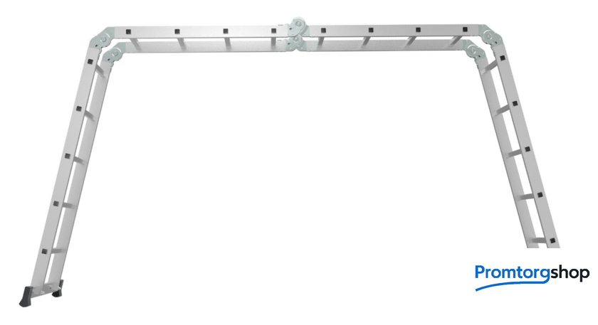 | Тип | лестница-трансформер, неразборная, складная. Универсальная шарнирная лестница-трансформер «4 в 1»: приставная лестница, стремянка, Г-образная лестница, помост увеличенной ширины. В сложенном виде помещается в багажник. Высокая прочность и малая глубина прогиба при лёгком весе. Стойки и перекладины из экструдированного алюминия. Стойки с усилением в местах наибольшей нагрузки. Шарнирные замки фиксируются одной рукой и исключают защемление пальцев. Увеличенные рифлёные перекладины 28×28 мм для надежного сцепления. Вальцовочное соединение перекладин. По прочности не уступает сварке. Съёмные траверсы стабилизируют конструкцию. Наконечники траверс из ударопрочного пластика. Не скользят и не повреждают поверхность. Страна производства: Россия |