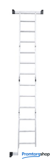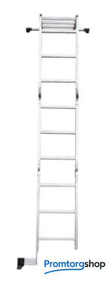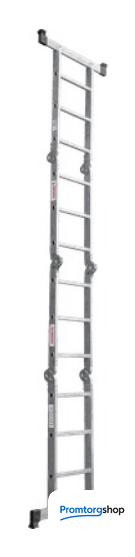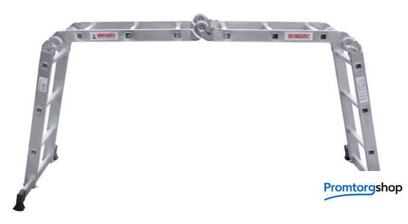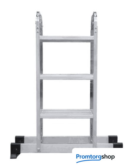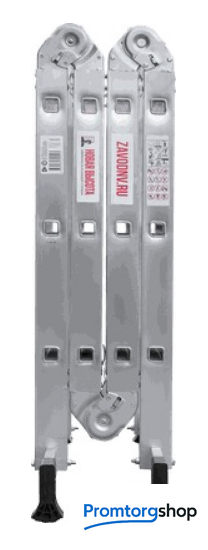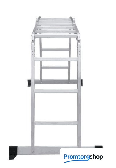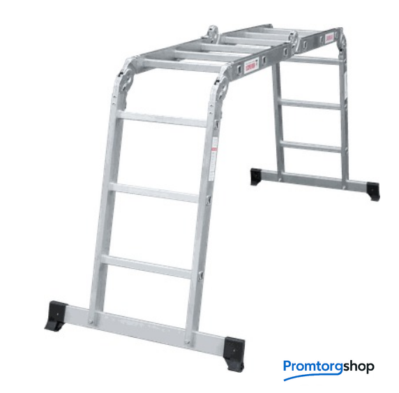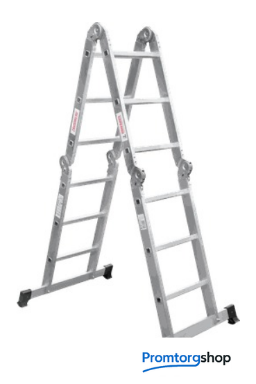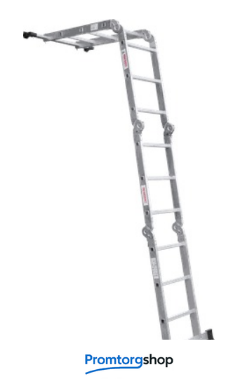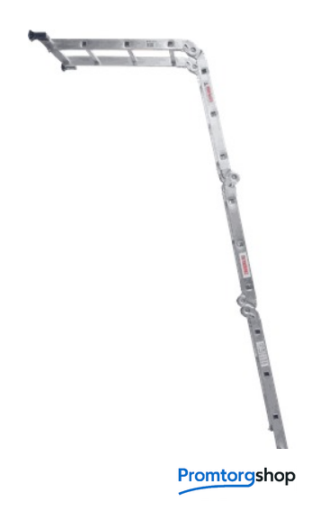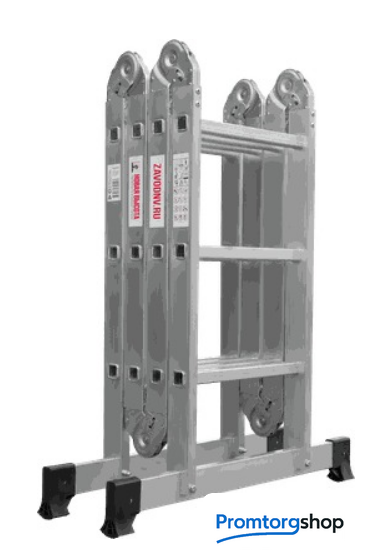 | Тип | лестница-трансформер, неразборная, складная. Универсальная шарнирная лестница-трансформер «4 в 1»: приставная лестница, стремянка, Г-образная лестница, помост увеличенной ширины. В сложенном виде помещается в багажник. Высокая прочность и малая глубина прогиба при лёгком весе. Стойки и перекладины из экструдированного алюминия. Стойки с усилением в местах наибольшей нагрузки. Шарнирные замки фиксируются одной рукой и исключают защемление пальцев. Увеличенные рифлёные перекладины 28×28 мм для надежного сцепления. Вальцовочное соединение перекладин. По прочности не уступает сварке. Съёмные траверсы стабилизируют конструкцию. Наконечники траверс из ударопрочного пластика. Не скользят и не повреждают поверхность. Страна производства: Россия |
