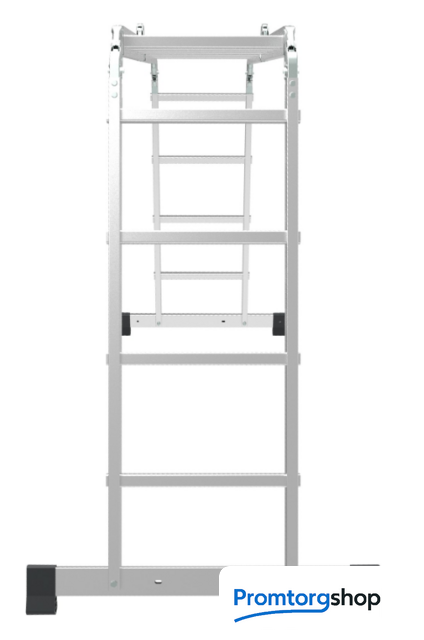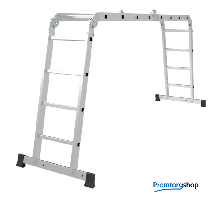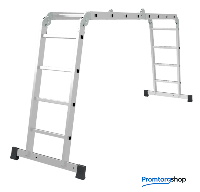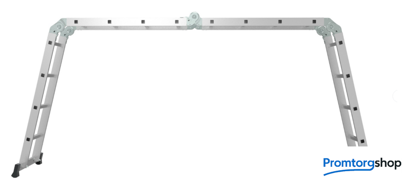 | Тип | лестница-трансформер, неразборная, складная. Универсальная шарнирная лестница-трансформер «4 в 1»: приставная лестница, стремянка, Г-образная лестница, помост увеличенной ширины. В сложенном виде помещается в багажник. Высокая прочность и малая глубина прогиба при лёгком весе. Стойки и перекладины из экструдированного алюминия. Стойки с усилением в местах наибольшей нагрузки. Шарнирные замки фиксируются одной рукой и исключают защемление пальцев. Увеличенные рифлёные перекладины 28×28 мм для надежного сцепления. Вальцовочное соединение перекладин. По прочности не уступает сварке. Съёмные траверсы стабилизируют конструкцию. Наконечники траверс из ударопрочного пластика. Не скользят и не повреждают поверхность. Страна производства: Россия |