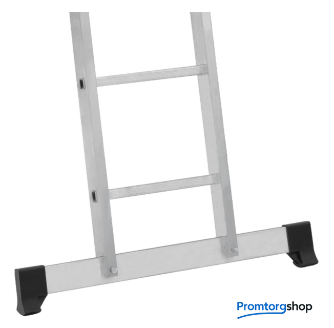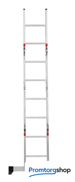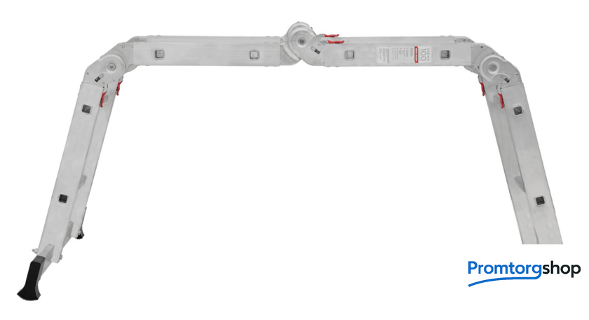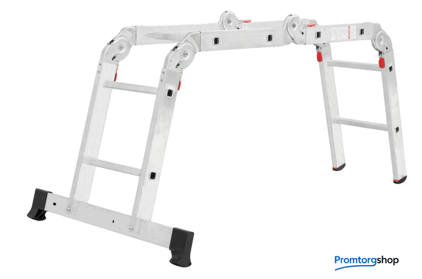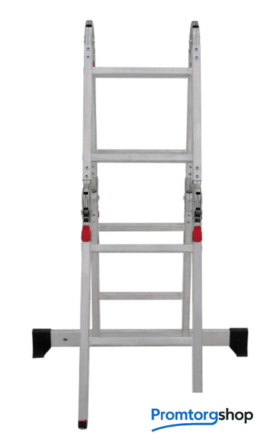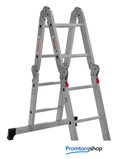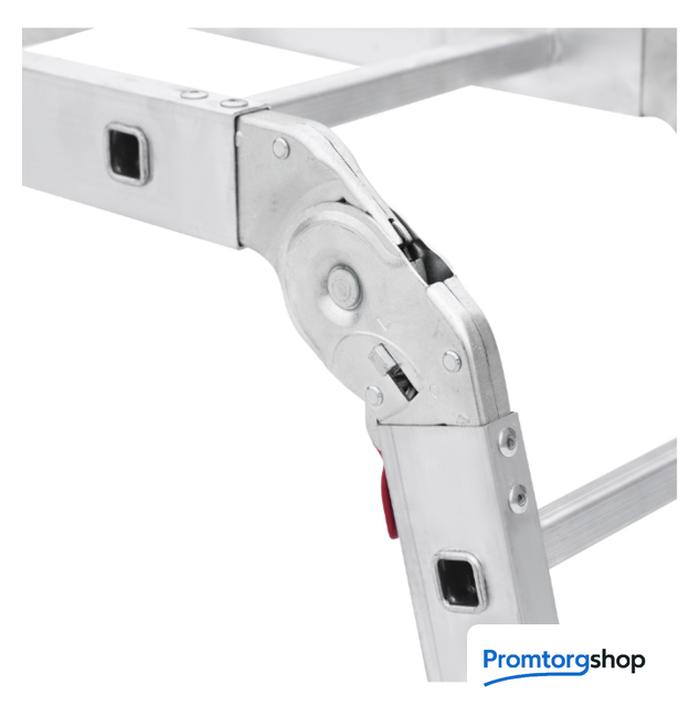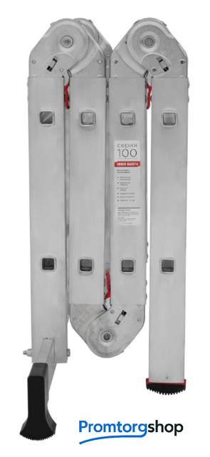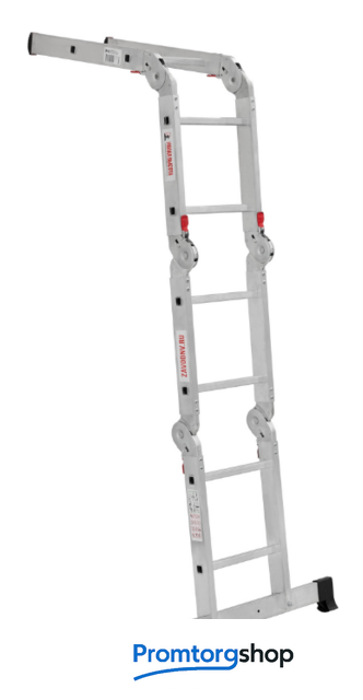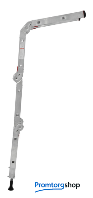 | Тип | лестница-трансформер, неразборная, складная. Многофункциональная шарнирная лестница «4 в 1» для универсального использования с повышенными нагрузками: приставная, Г-образная с опорой на стену, двухсторонняя стремянка, помост. Стойки и перекладины из экструдированного алюминиевого профиля. Рифлёные перекладины 23×23 мм для надёжного сцепления. Вальцовочное крепление перекладин. По прочности не уступает сварке. Шарнирные замки с автоматической фиксацией регулируются одной рукой. Широкая опорная траверса стабилизирует конструкцию (траверса в комплекте 1 шт.). Башмаки траверс из прочного пластика. Не скользят и не повреждают поверхность. Возможность установки съёмного настила из антисептированной фанеры для использования в положении «Помост» (приобретается отдельно). Допустимая нагрузка на лестницу в положении «помост»-100 кг. Страна производства: Россия |