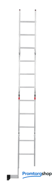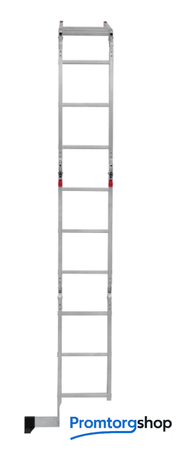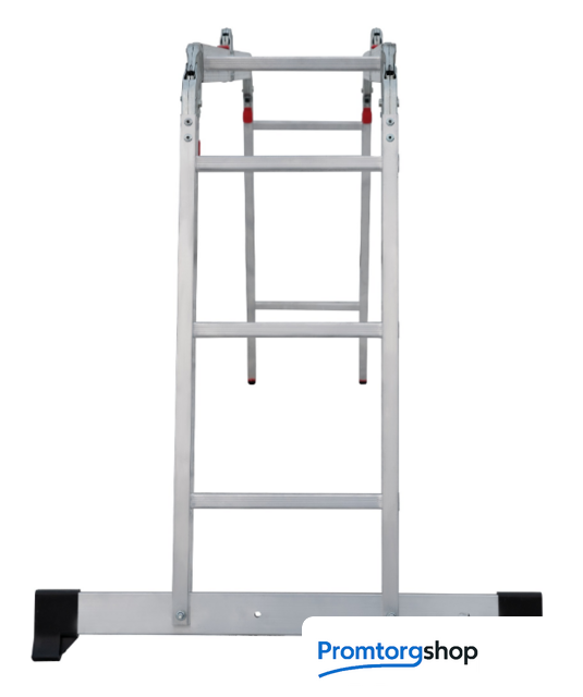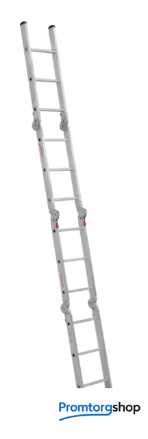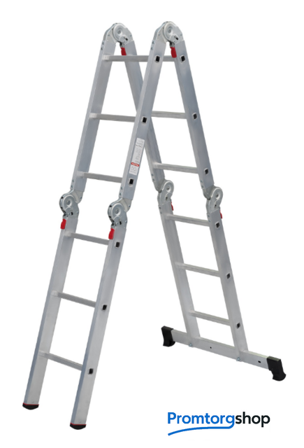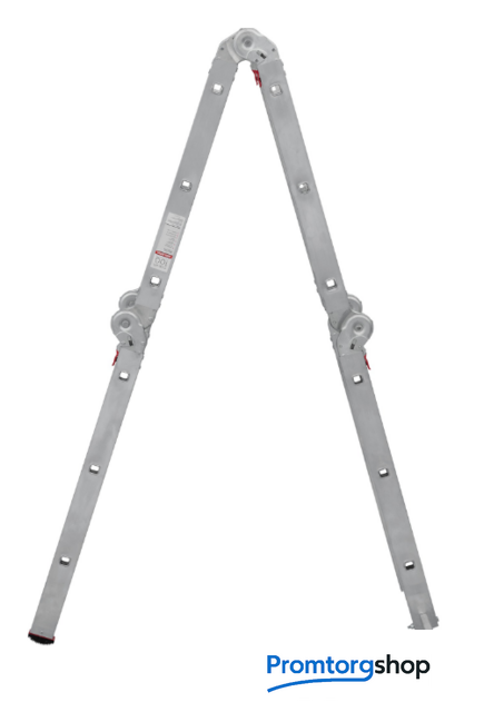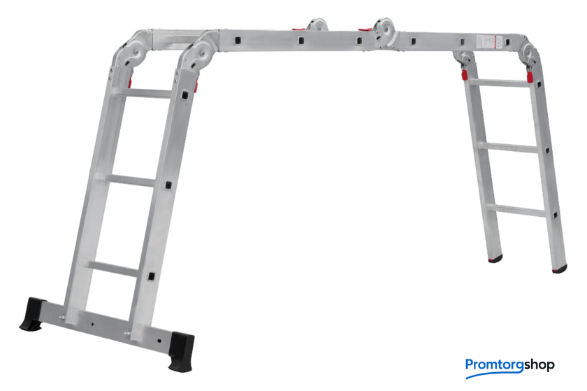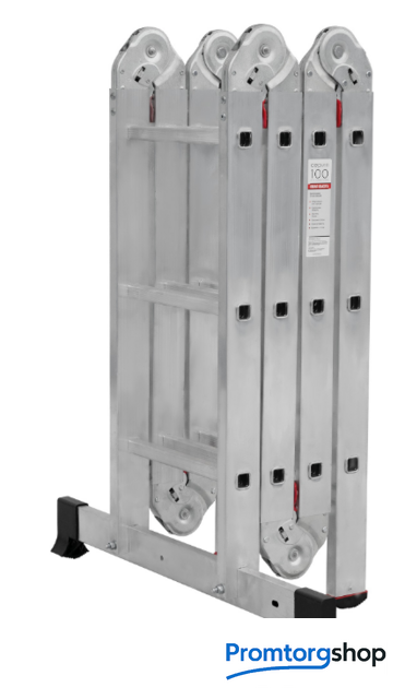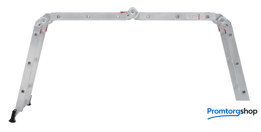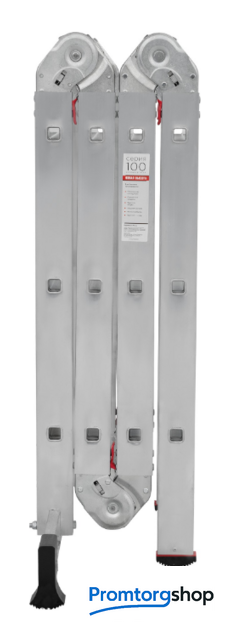| Тип | лестница-трансформер, неразборная, складная. Многофункциональная шарнирная лестница «4 в 1» для универсального использования с повышенными нагрузками: приставная, Г-образная с опорой на стену, двухсторонняя стремянка, помост. Стойки и перекладины из экструдированного алюминиевого профиля. Рифлёные перекладины 23×23 мм для надёжного сцепления. Вальцовочное крепление перекладин. По прочности не уступает сварке. Шарнирные замки с автоматической фиксацией регулируются одной рукой. Широкая опорная траверса стабилизирует конструкцию (траверса в комплекте 1 шт.). Башмаки траверс из прочного пластика. Не скользят и не повреждают поверхность. Возможность установки съёмного настила из антисептированной фанеры для использования в положении «Помост» (приобретается отдельно). Допустимая нагрузка на лестницу в положении «помост»-100 кг. Страна производства: Россия |