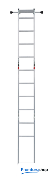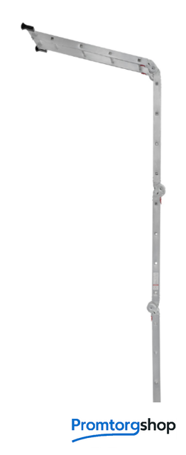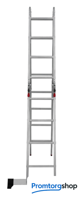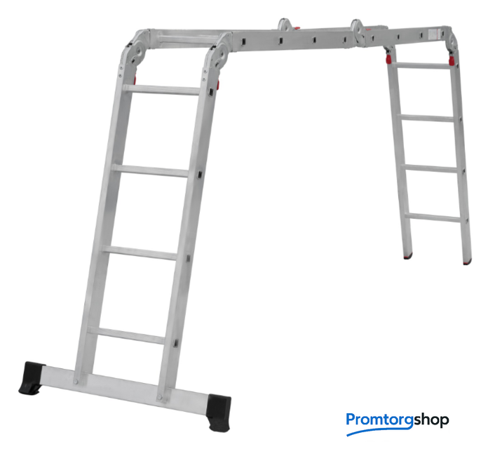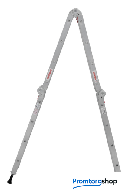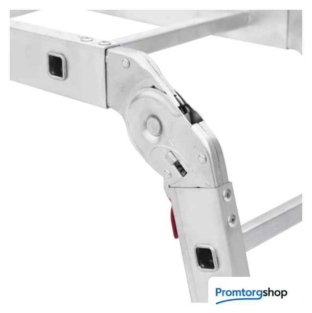 | Тип | лестница-трансформер, неразборная, складная. Многофункциональная шарнирная лестница «4 в 1» для универсального использования с повышенными нагрузками: приставная, Г-образная с опорой на стену, двухсторонняя стремянка, помост. Стойки и перекладины из экструдированного алюминиевого профиля. Рифлёные перекладины 23×23 мм для надёжного сцепления. Вальцовочное крепление перекладин. По прочности не уступает сварке. Шарнирные замки с автоматической фиксацией регулируются одной рукой. Широкая опорная траверса стабилизирует конструкцию (траверса в комплекте 1 шт.). Башмаки траверс из прочного пластика. Не скользят и не повреждают поверхность. Возможность установки съёмного настила из антисептированной фанеры для использования в положении «Помост» (приобретается отдельно). Допустимая нагрузка на лестницу в положении «помост»-100 кг. Страна производства: Россия |