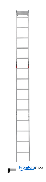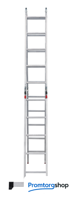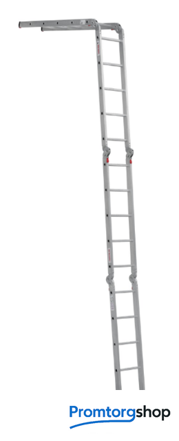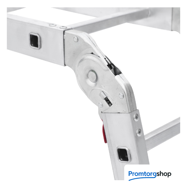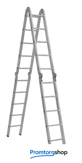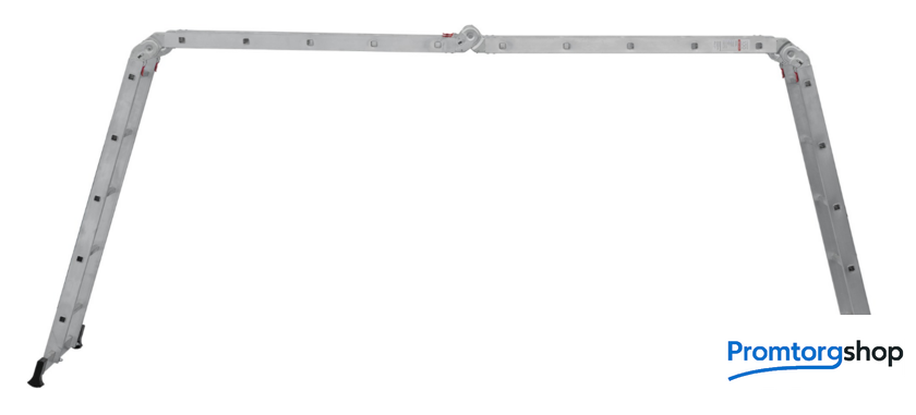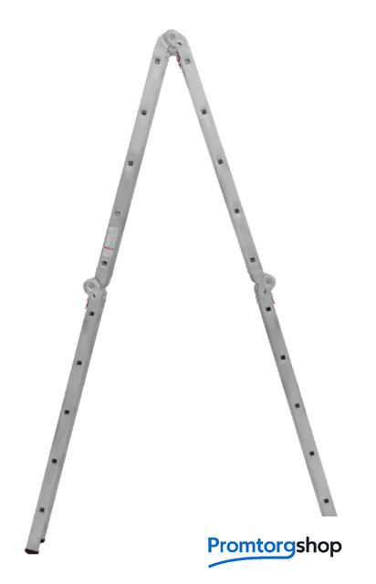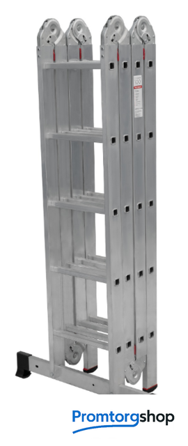 | Тип | лестница-трансформер, неразборная, складная. Многофункциональная шарнирная лестница «4 в 1» для универсального использования с повышенными нагрузками: приставная, Г-образная с опорой на стену, двухсторонняя стремянка, помост. Стойки и перекладины из экструдированного алюминиевого профиля. Рифлёные перекладины 23×23 мм для надёжного сцепления. Вальцовочное крепление перекладин. По прочности не уступает сварке. Шарнирные замки с автоматической фиксацией регулируются одной рукой. Широкая опорная траверса стабилизирует конструкцию (траверса в комплекте 1 шт.). Башмаки траверс из прочного пластика. Не скользят и не повреждают поверхность. Возможность установки съёмного настила из антисептированной фанеры для использования в положении «Помост» (приобретается отдельно). Допустимая нагрузка на лестницу в положении «помост»-100 кг. Страна производства: Россия |