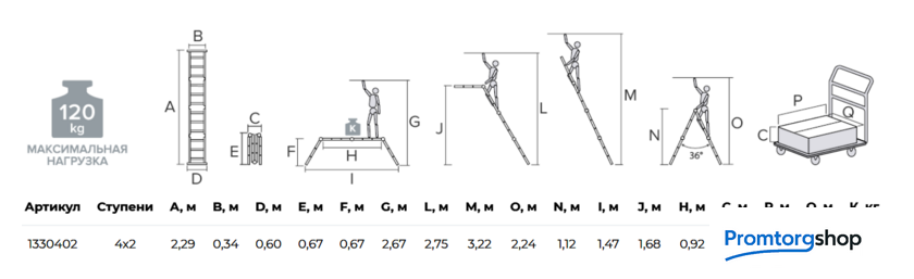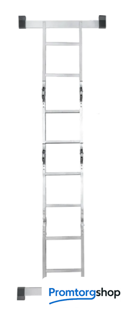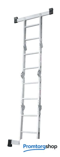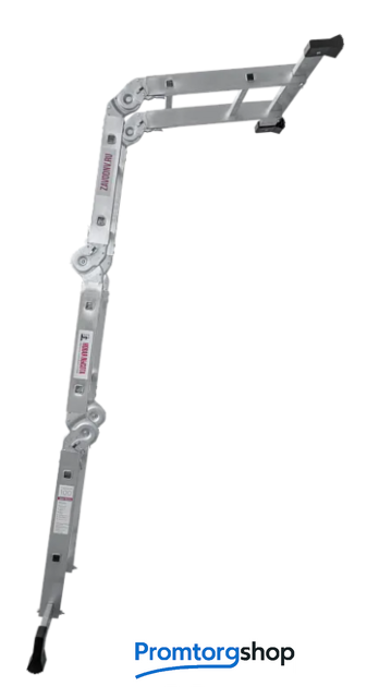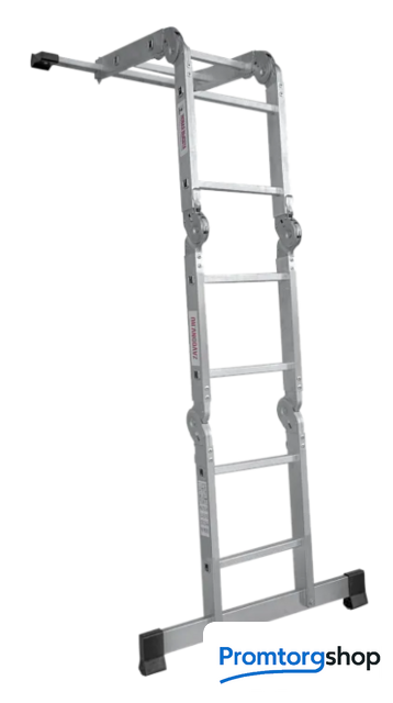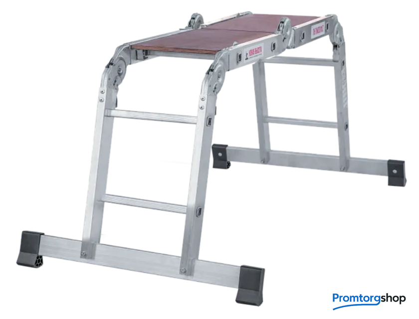 | Тип | лестница-трансформер, неразборная, складная. Многофункциональная шарнирная лестница «4 в 1» для бытового использования: приставная, Г-образная с опорой на стену, двухсторонняя стремянка, помост со съёмным настилом. Съёмный настил из антисептированной фанеры для положения «Помост» в комплекте. Стойки и перекладины из экструдированного алюминиевого профиля. Рифлёные перекладины 23×23 мм для надёжного сцепления. Вальцовочное крепление перекладин. По прочности не уступает сварке. Шарнирные замки с автоматической фиксацией регулируются одной рукой. 2 широкие съёмные опорные траверсы стабилизируют конструкцию. Башмаки траверс из прочного пластика. Не скользят и не повреждают поверхность. |