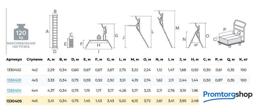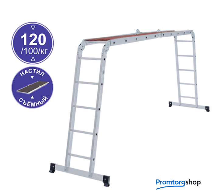 | Тип | лестница-трансформер, неразборная, складная. Универсальная шарнирная лестница-трансформер «4 в 1»: приставная лестница, стремянка, Г-образная лестница, помост увеличенной ширины. Ширина трансформера 340 мм. Съёмный настил из антисептированной фанеры для положения «Помост» в комплекте. Максимальная нагрузка в положении помост - 100 кг, в остальных положениях - 120 кг. Стойки и перекладины из экструдированного алюминиевого профиля. Рифлёные перекладины 23×23 мм для надёжного сцепления. Вальцовочное крепление перекладин. По прочности не уступает сварке. Шарнирные замки с автоматической фиксацией регулируются одной рукой. 2 широкие съёмные опорные траверсы стабилизируют конструкцию. Башмаки траверс из прочного пластика. Не скользят и не повреждают поверхность. |