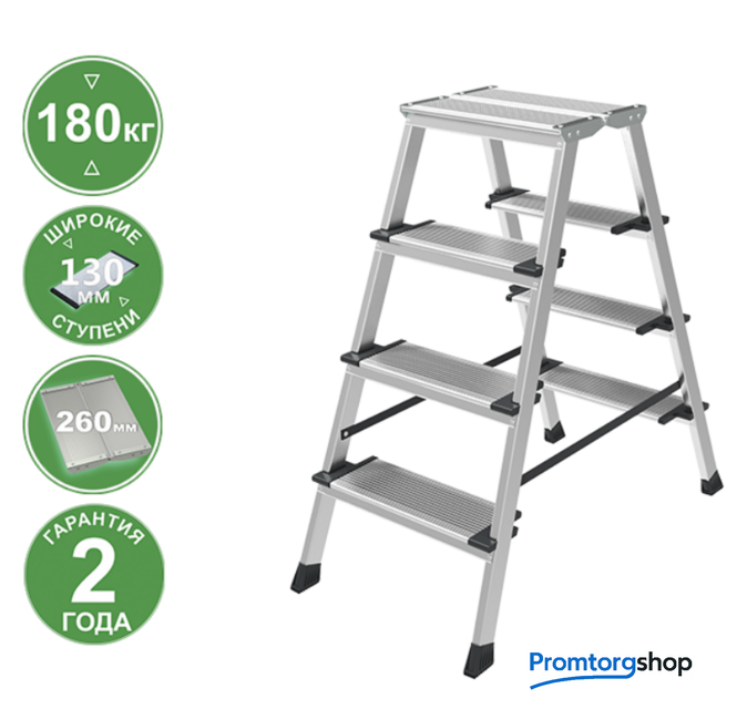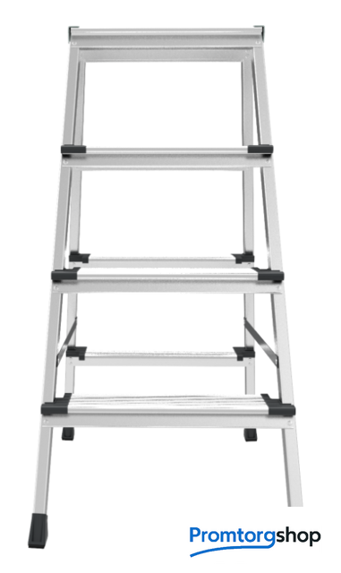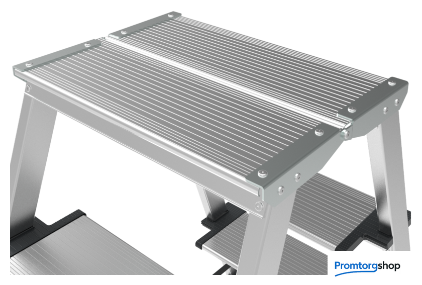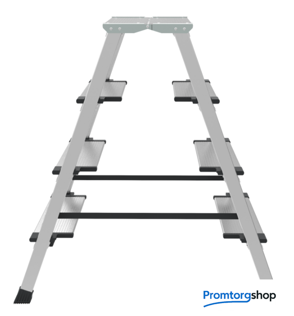 | Тип | лестница-стремянка, складная, неразборная. Усиленная стремянка для универсального применения с увеличенной верхней площадкой и широкими комфортными ступенями. Ноги не устают при длительной работе. складная площадка 260×350 мм из 2 ступеней. Увеличенный радиус работы. широкие комфортные ступени глубиной 130 мм. Меньше усталости при длительной работе. стойки и ступени из экструдированного алюминиевого профиля. заклёпочное крепление ступеней. Высокая статическая и динамическая прочность. закруглённые безопасные края ступеней и площадки смягчают контакт с голенью, предотвращают травмы. пластиковые повторяющие рельеф заглушки ступеней с длительным сроком службы скрывают острые грани и углы. компактно складывается для хранения и транспортировки. В сложенном состоянии занимает мало места. башмаки из 2х-компонентного пластика с прорезиненной опорой и большим пятном контакта 13 см2. Не скользят и не повреждают поверхность. |