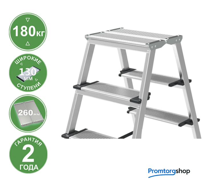 | Тип | лестница-стремянка, складная, неразборная. Усиленная стремянка для универсального применения с увеличенной верхней площадкой и широкими комфортными ступенями. Ноги не устают при длительной работе. складная площадка 260×350 мм из 2 ступеней. Увеличенный радиус работы. широкие комфортные ступени глубиной 130 мм. Меньше усталости при длительной работе. стойки и ступени из экструдированного алюминиевого профиля. заклёпочное крепление ступеней. Высокая статическая и динамическая прочность. закруглённые безопасные края ступеней и площадки смягчают контакт с голенью, предотвращают травмы. пластиковые повторяющие рельеф заглушки ступеней с длительным сроком службы скрывают острые грани и углы. компактно складывается для хранения и транспортировки. В сложенном состоянии занимает мало места. башмаки из 2х-компонентного пластика с прорезиненной опорой и большим пятном контакта 13 см2. Не скользят и не повреждают поверхность. |